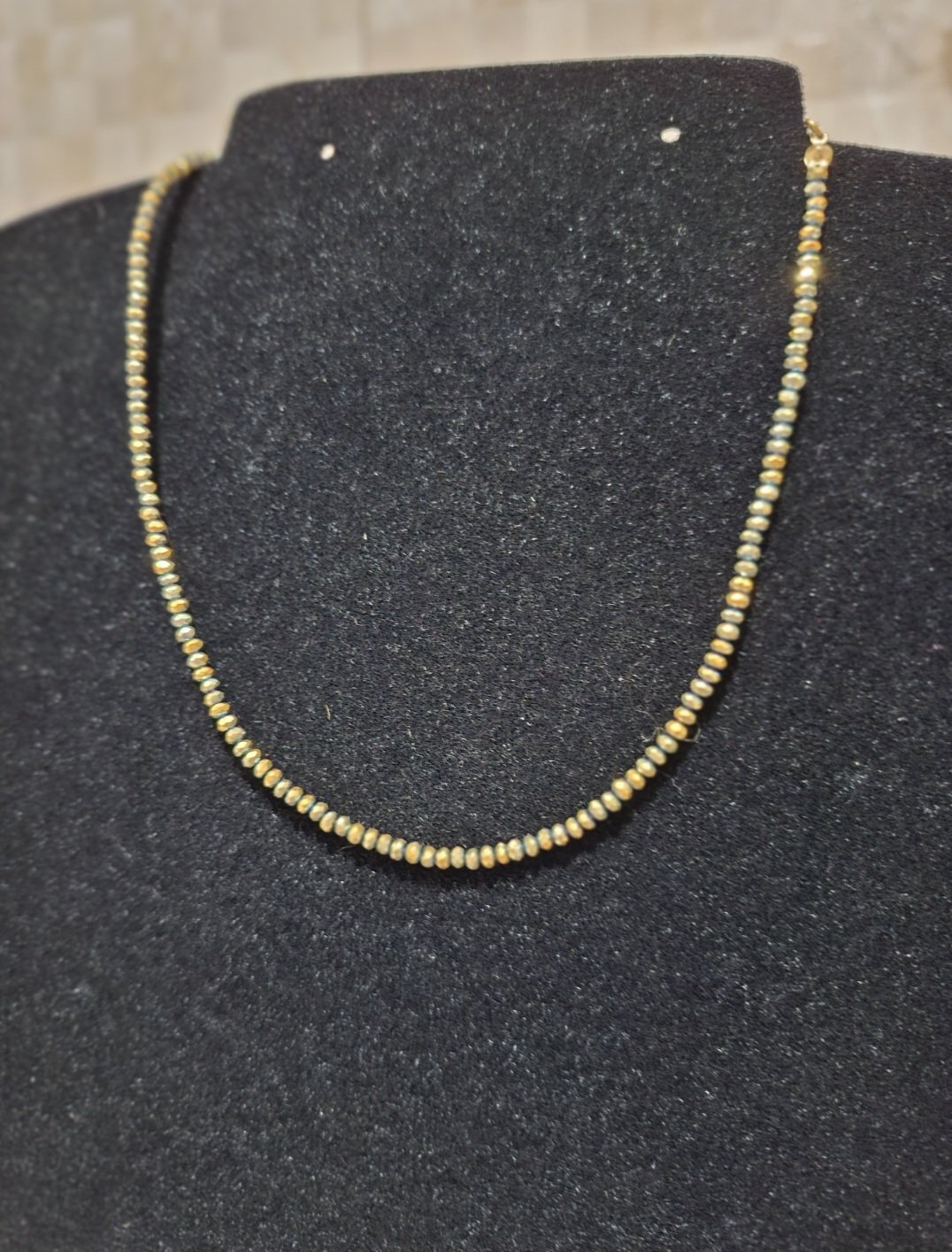 Hematita dourada é uma pedra preciosa que passa por um banho de ouro 18k, para adicionar um acabamento dourado e com muito brilho. 40cm.