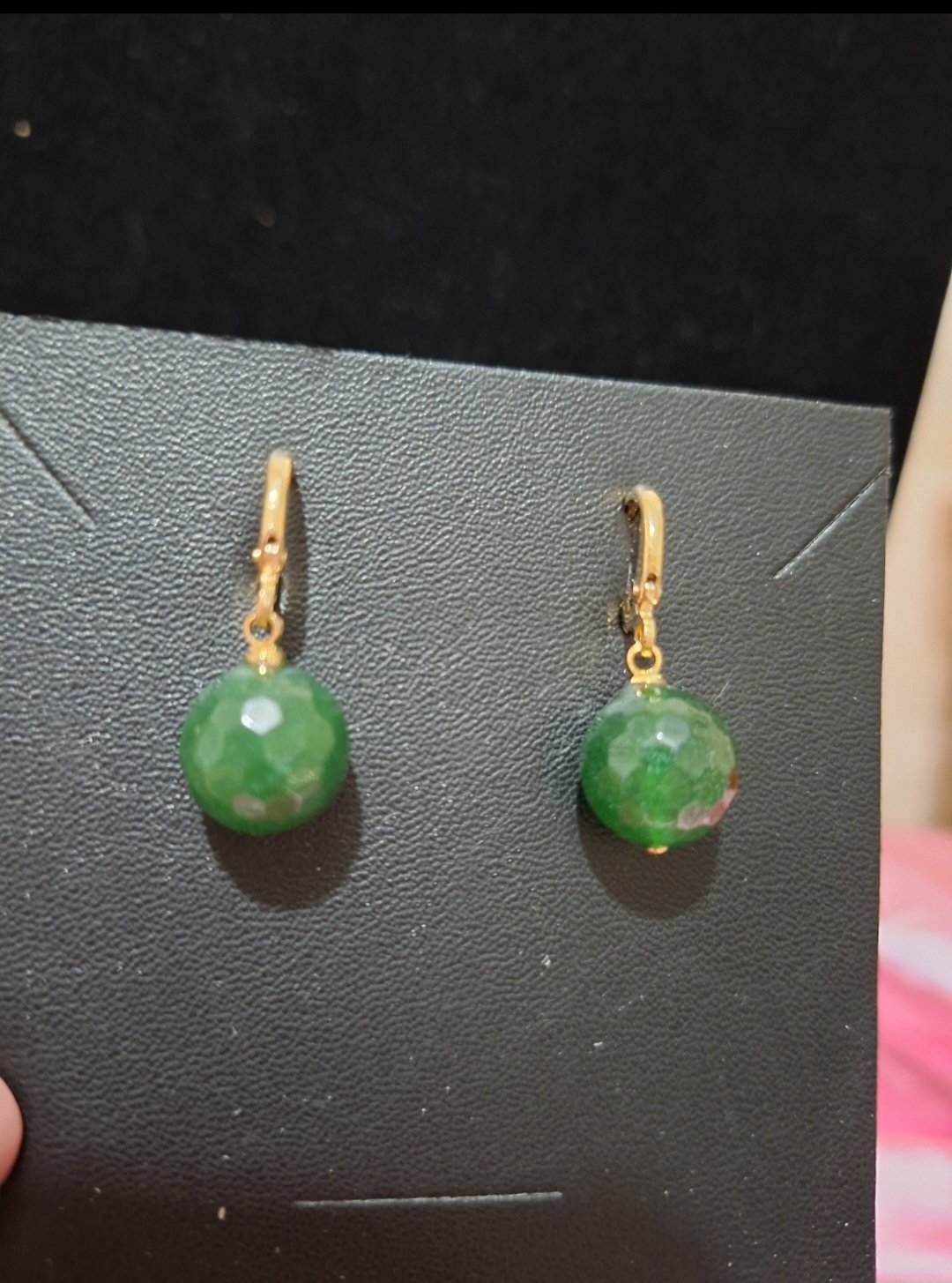 Um brinco de argolinha de Jade natural lapidação briolet, que mostra seu brilho de longe.
